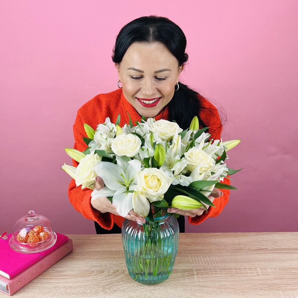 Почему этот подарок особенныйСоздайте особый момент с этим великолепным букетом белых лилий, роз и альстромерий. Классический дизайн букета цветов издает простоту и чистоту. Каким бы ни был случай, букет цветов сделает день получателя счастливым.