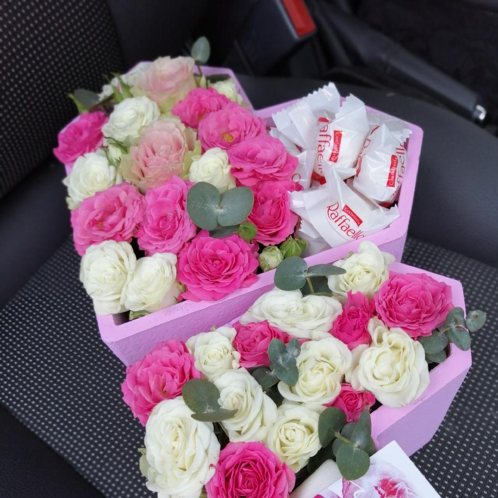 Коробка в виде сердца с миксом из роз и конфетами рафаэлло