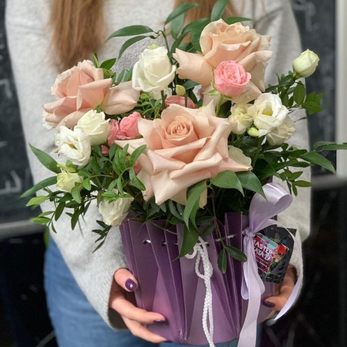 Роза – 3 шт. Эустома – 3 шт. Кустовая роза пионовидная – 3 шт. Писташ – 5 шт. Итальянский рускус – 1 шт.