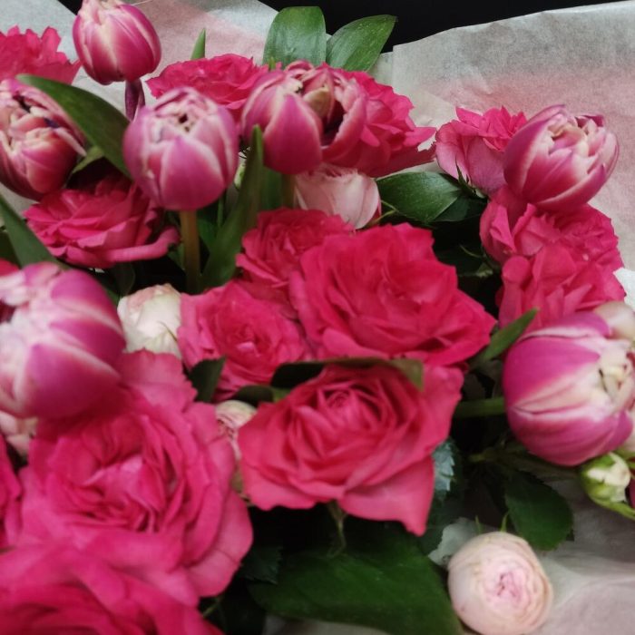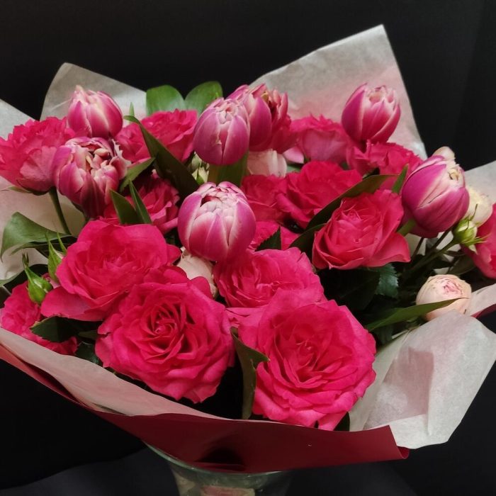 Рускус – 11 шт.Роза кустовая – 7 шт.Тюльпан – 7 шт.Упаковка дизайнерская – 1 шт.Лента атласная – 3 шт.