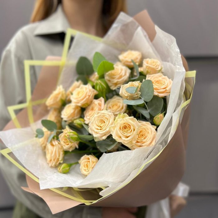 Эвкалипт – 3 шт.Лента атласная – 2 шт.Пленка матовая – 4 шт.Тишью белое – 3 шт.роза кустовая таня – 5 шт.пленка дизайнерская с каймой – 2 шт.