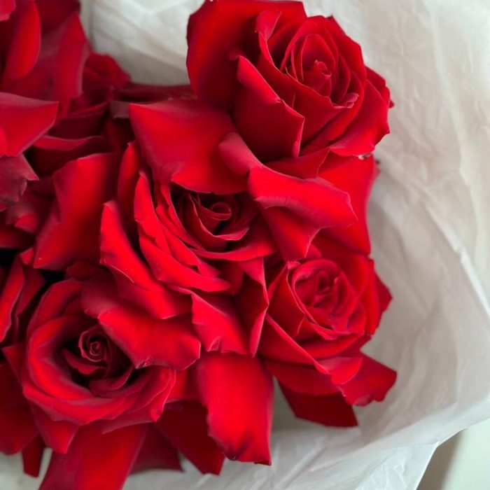 Французские бархатные алые розы в белоснежной упаковке