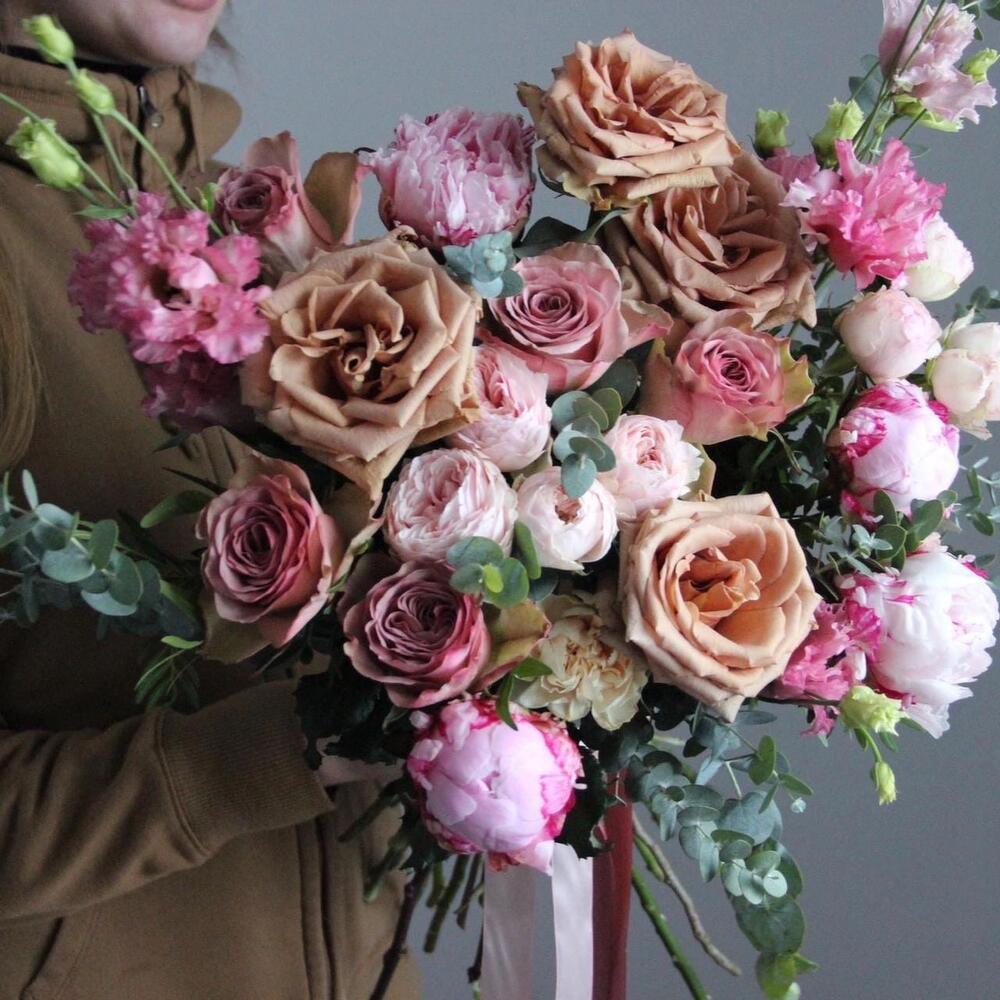 Пион – 4 шт.роза тоффи – 4 шт.Роза сортовая – 5 шт.Роза кустовая пионовидная – 2 шт.Лизиантус – 3 шт.Диантус – 3 шт.Эвкалипт – 7 шт.Лента – 1 шт.