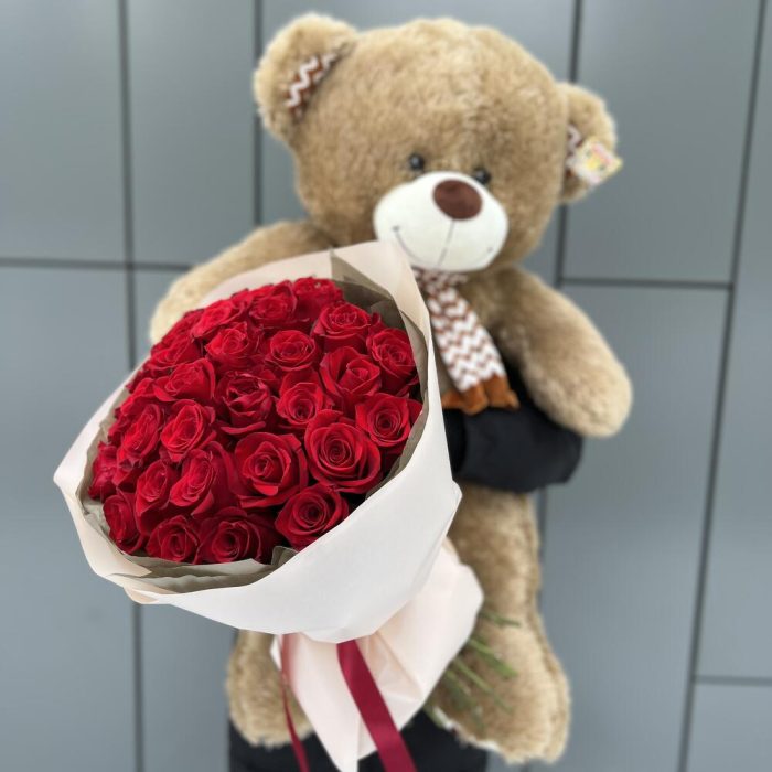 Комбо 1 из 35 красных роз и мягкой игрушки медведя