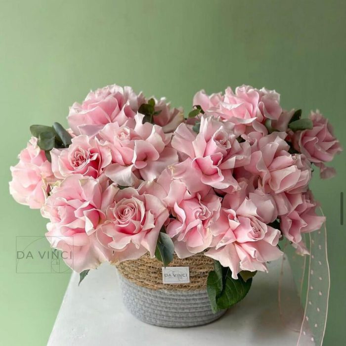 Чудо-композиция от DaVinci Flowers в кашпо с голландскими розами и эвкалиптом.