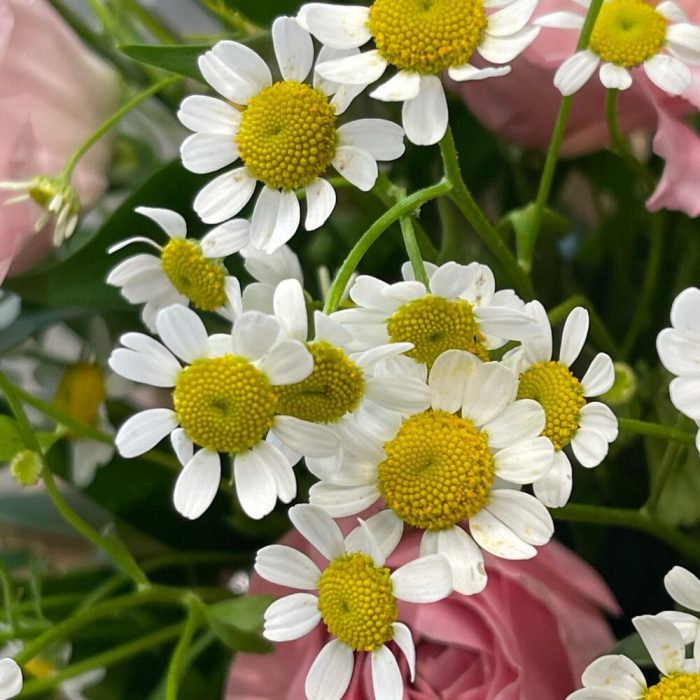 Лизиантус – 2 шт.Роза кустовая – 1 шт.Матрикария – 2 шт.Фисташка – 1 шт.Колоски – 3 шт.Упаковка дизайнерская – 1 шт.Оазис флористический – 1 шт.