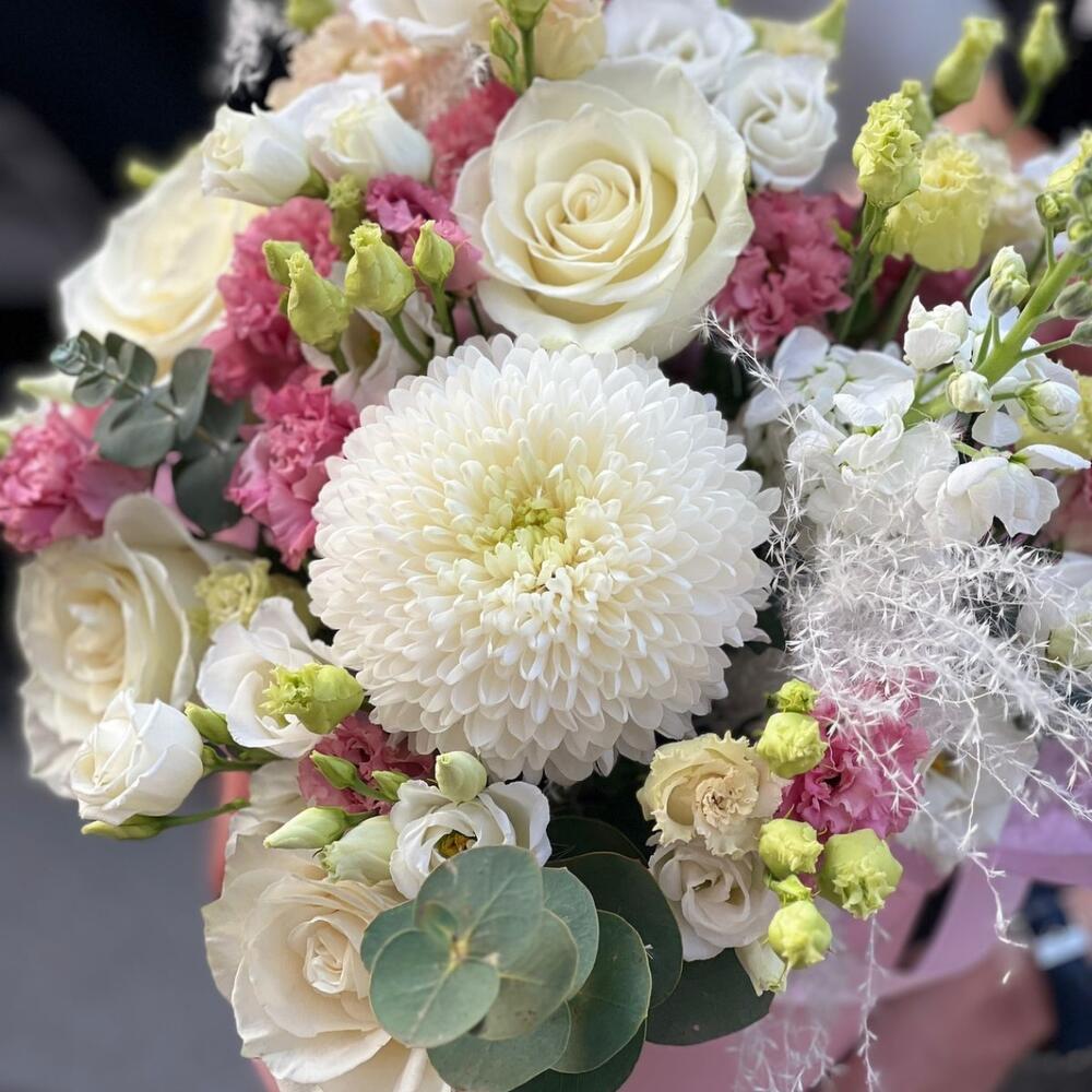 Маттиола – 1 шт.Хризантема – 1 шт.Тишью – 1 шт.Коробка шляпная – 1 шт.Роза Мондиаль – 4 шт.эустома розовая – 3 шт.Эвкалипт Микс – 4 шт.Оазис флористический – 2 шт.эустома белая – 4 шт.пампасная трава – 2 шт.