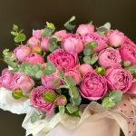 Композиция в коробке из Кустовых пионовидных роз и эустомы