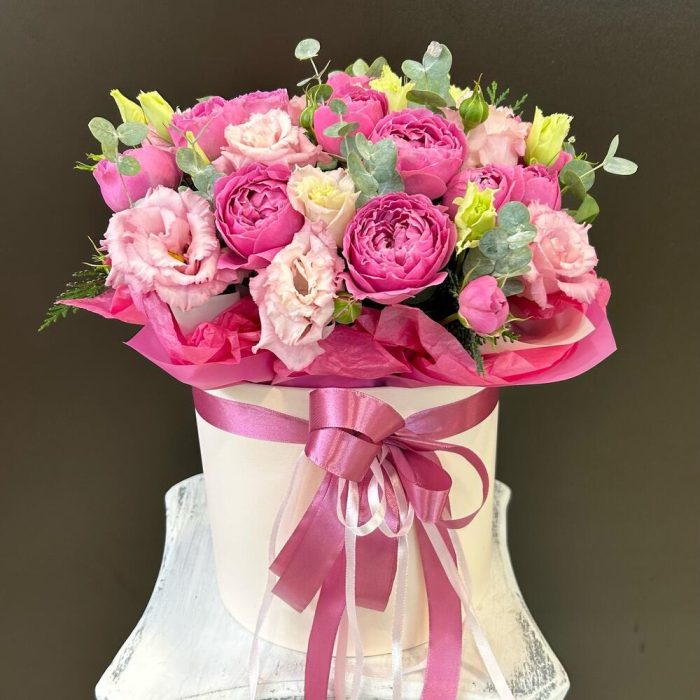 Коробка шляпная – 1 шт.Пиафлор (оазис) – 1 шт.Лента атласная – 3 шт.Роза кустовая пионовидная – 10 шт.Эустома – 5 шт.Эвкалипт – 4 шт.Зелень – 5 шт.Упаковка – 3 шт.
