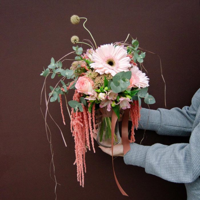 Альстромерия – 2 шт. Маттиола – 3 шт. Эвкалипт – 1 шт. Амарант – 1 шт. циперус папирус – 2 шт. Гербера – 1 шт. Ваза – 1 шт. Роза – 3 шт.