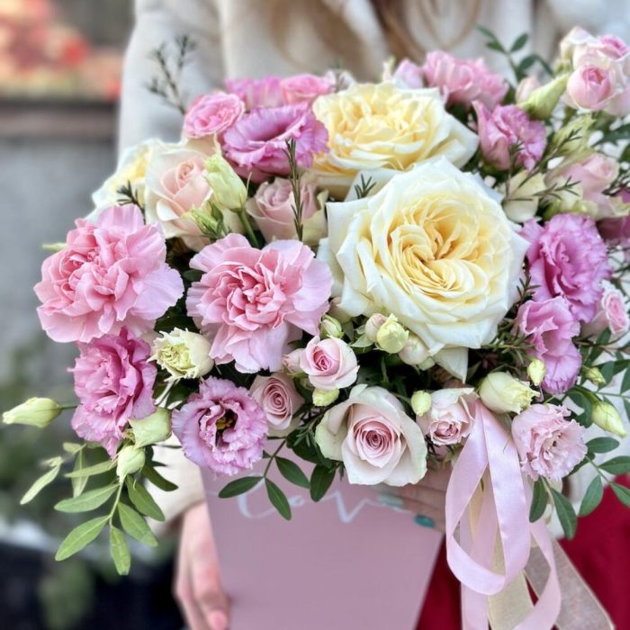 Роза пионовидная – 2 шт.Роза – 5 шт.лизиантус розовый алиса – 4 шт.Роза кустовая – 2 шт.Диантус – 5 шт.декоративная зелень – 5 шт.Коробка – 1 шт.Флористическая губка – 1 шт.Бант – 1 шт.