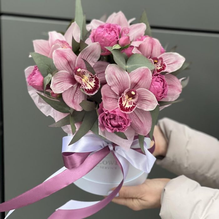 Коробка Тиффани из цимбидиума и кустовых пионовидных роз