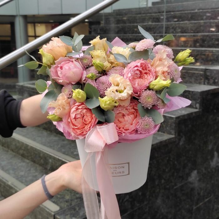Лента – 2 шт.Лизиантус – 2 шт.Хризантема кустовая – 3 шт.Эвкалипт – 1 шт.Роза кустовая пионовидная – 1 шт.коробка кашпо – 1 шт.