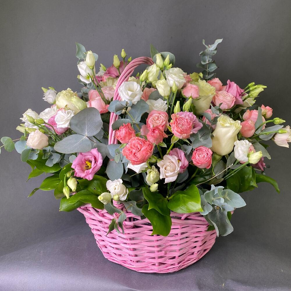 Роза Эквадор – 7 шт.Роза кустовая пионовидная – 7 шт.Лизиантус – 7 шт.Рускус – 10 шт.эвкалипт ветка – 2 шт.Оазис флористический – 2 шт.Корзина большая – 1 шт.