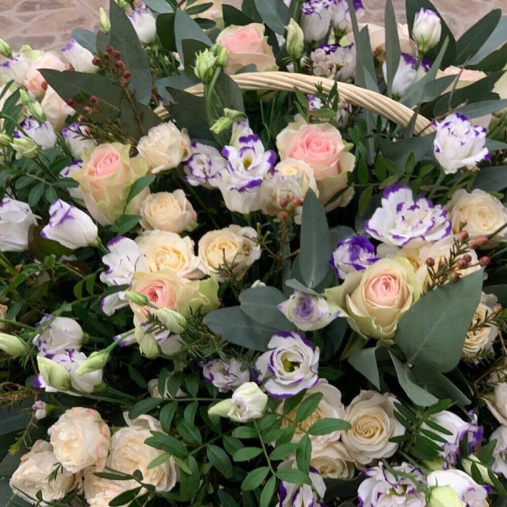 Ваксфлауэр – 2 шт.Лизиантус – 10 шт.Роза кустовая – 11 шт.Эвкалипт – 12 шт.Роза Эквадор – 15 шт.Фисташка – 10 шт.Корзина плетеная – 1 шт.Оазис флористический – 3 шт.