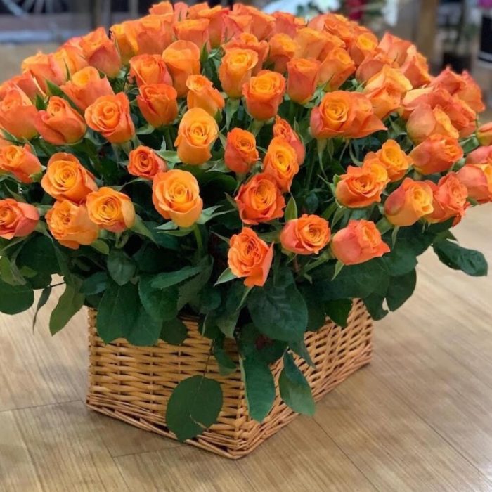 Роза оранжевая – 101 шт.Корзина плетеная – 1 шт.Лента атласная – 1 шт.Открытка – 1 шт.хорошее настроение – 100 шт.инструкция по уходу за цветами – 1 шт.Кризал – 1 шт.