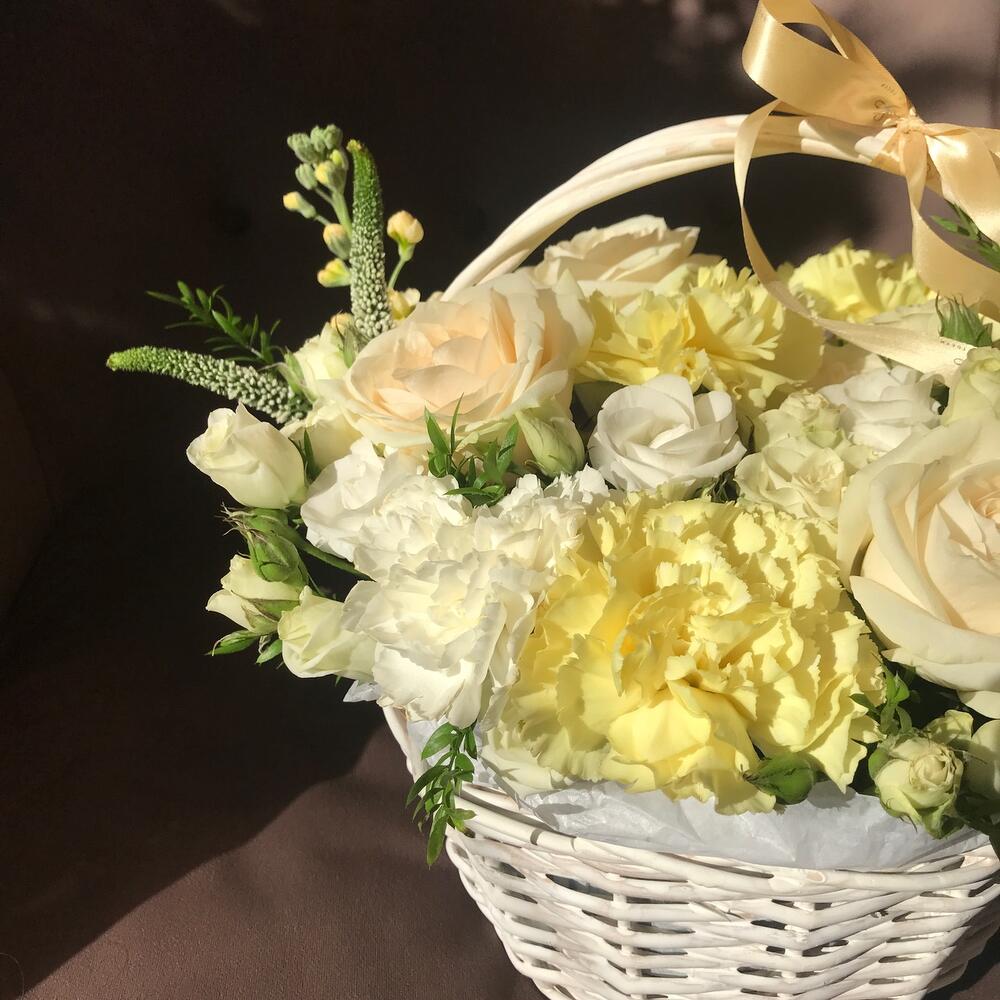 корзина 20 см – 1 шт.Губка флористическая – 1 шт.Роза кустовая – 3 шт.Лизиантус – 5 шт.Вероника – 3 шт.Маттиола – 2 шт.Аспарагус – 1 шт.Роза белая – 5 шт.Гвоздика – 7 шт.