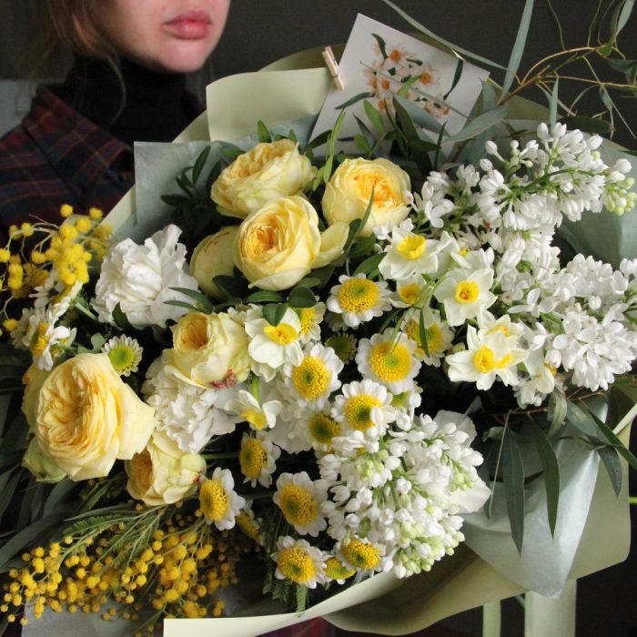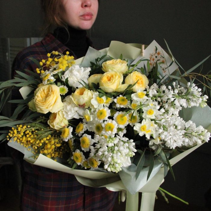 Роза кустовая пионовидная – 2 шт.Нарцисс – 2 шт.Сантини – 4 шт.Гвоздика – 4 шт.Эвкалипт – 5 шт.Фисташка – 2 шт.Мимоза – 2 шт.Маттиола – 1 шт.Сирень – 2 шт.