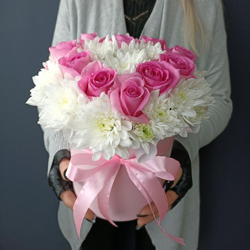 Хризантема кустовая – 4 шт.Роза – 10 шт.Шляпная коробка с лентами – 1 шт.