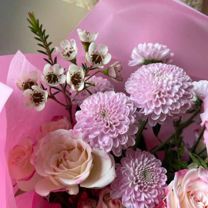 Ваксфлауэр – 1 шт.Лизиантус – 1 шт.Кустовая роза – 5 шт.Хризантема – 2 шт.Упаковка – 6 шт.Фисташка – 2 шт.