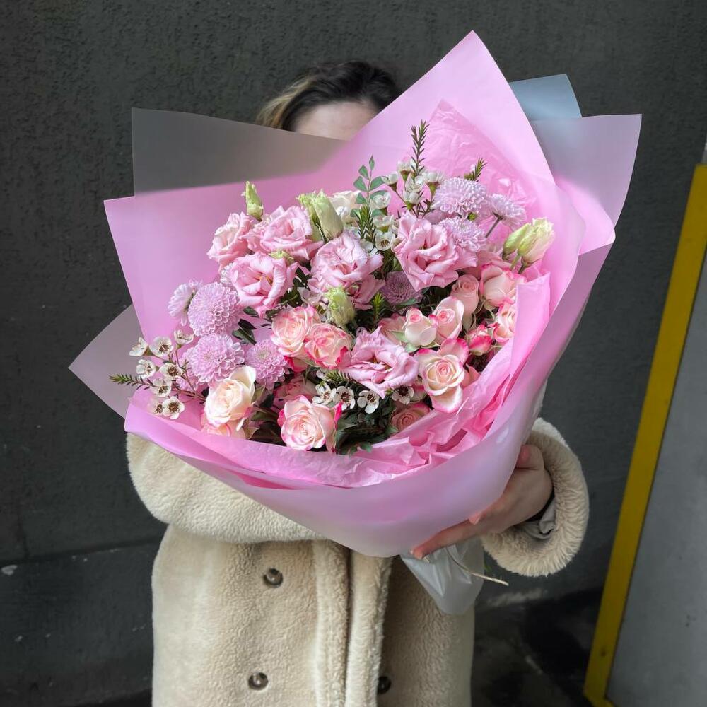 Малиновый зефир: розы, эустома и хризантема