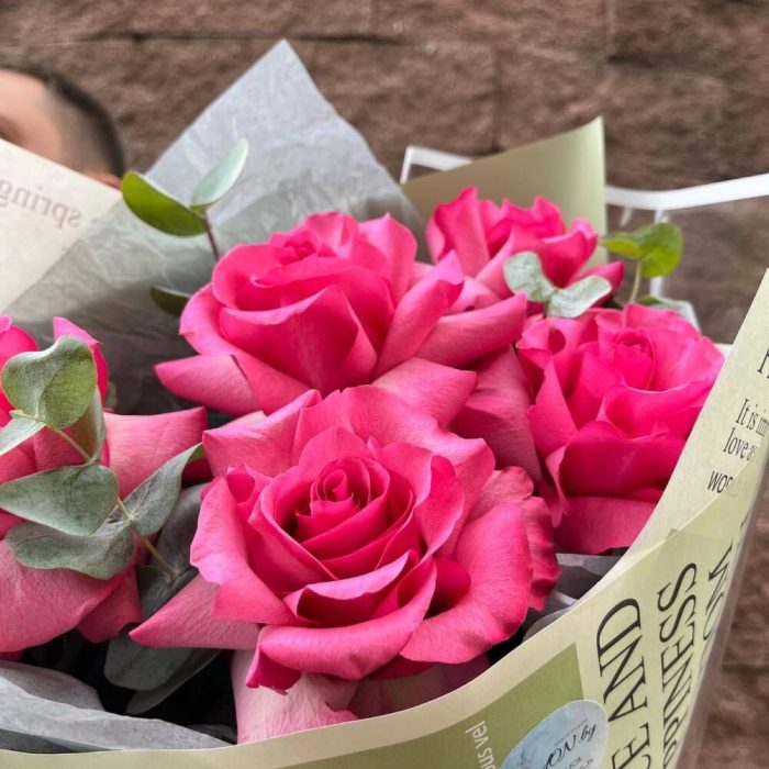 Букет из 9 розовых роз с эвкалиптом