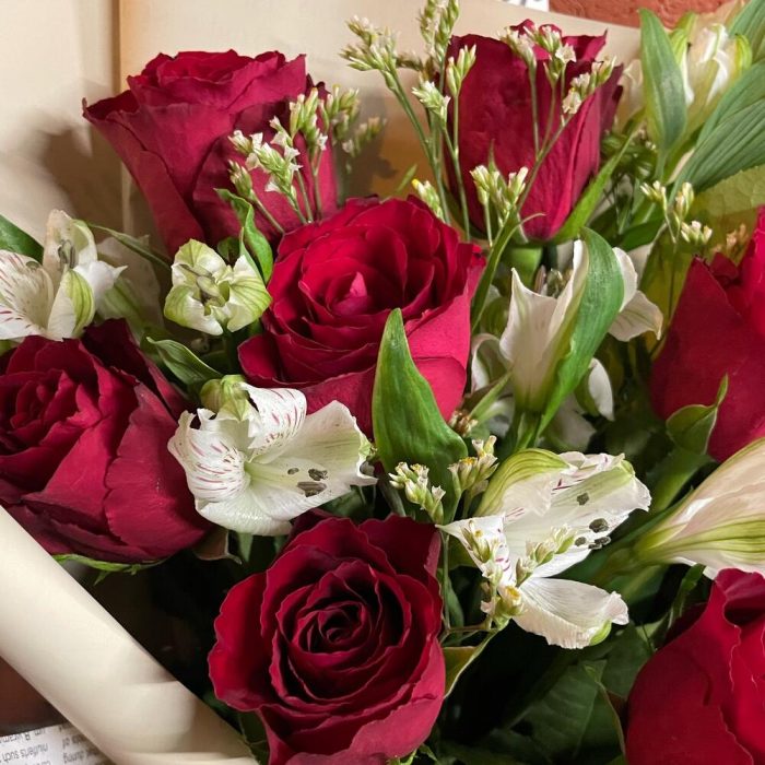 Роза красная – 9 шт.Альстромерия – 3 шт.Лимониум – 1 шт.Упаковка дизайнерская – 1 шт.Лента атласная – 1 шт.