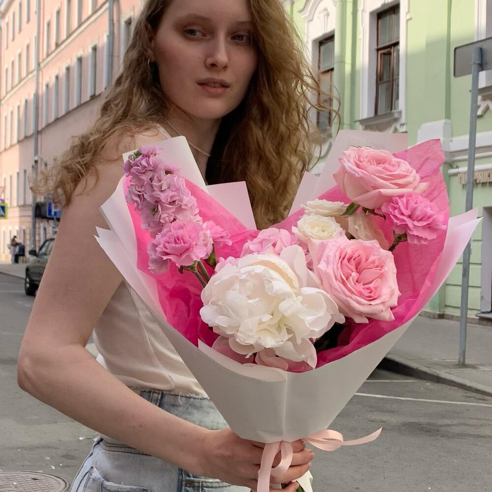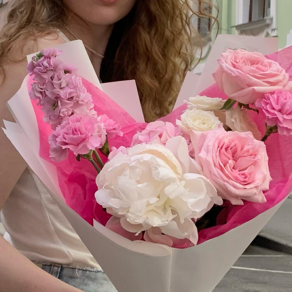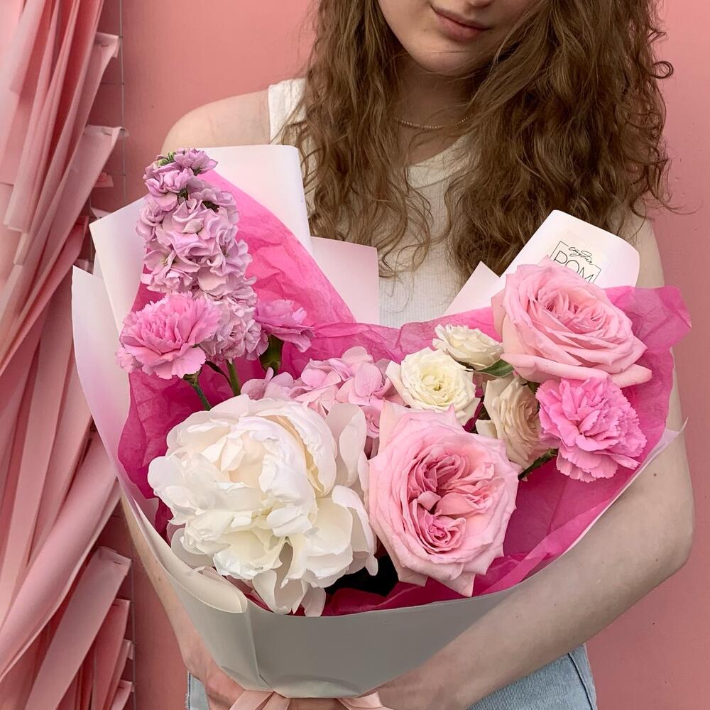 Гортензия – 1 шт.Маттиола – 1 шт.Гвоздика – 3 шт.Роза – 3 шт.Пион – 1 шт.Упаковка дизайнерская – 1 шт.