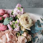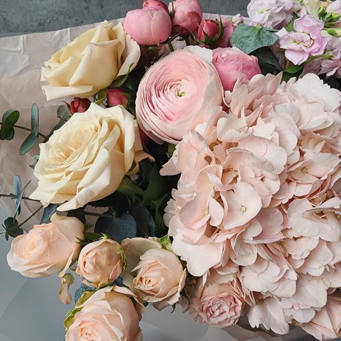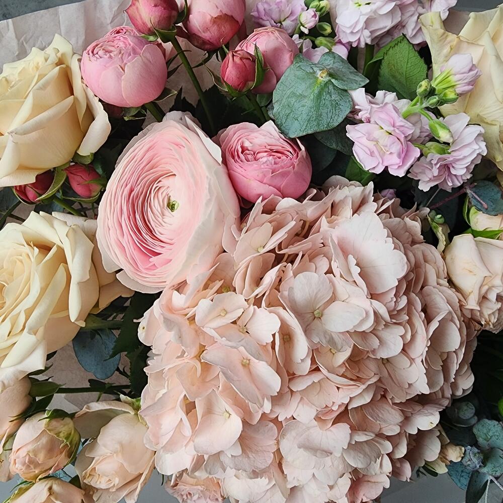 Эвкалипт – 4 шт.Роза Мента – 3 шт.Упаковка дизайнерская – 3 шт.Гортензия розовая – 1 шт.Кустовая пионовидная роза Бомбастик – 4 шт.Ранункулюс ханой – 1 шт.маттиола кустовая розовая – 1 шт.
