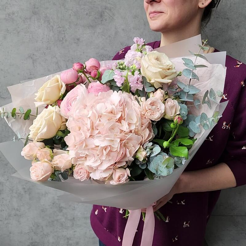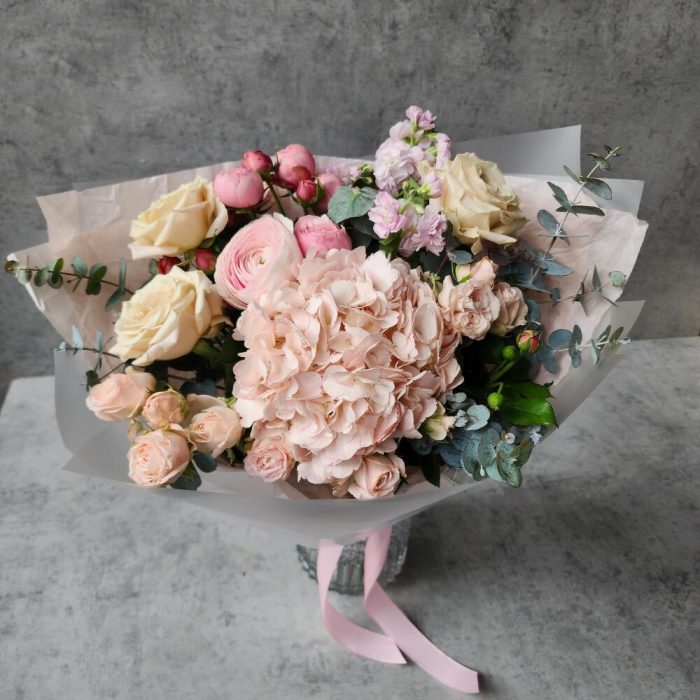 Нежный букет из гортензии, маттиолы, кустовой пион розы Бомбастик и розы Мента с эвкалиптом