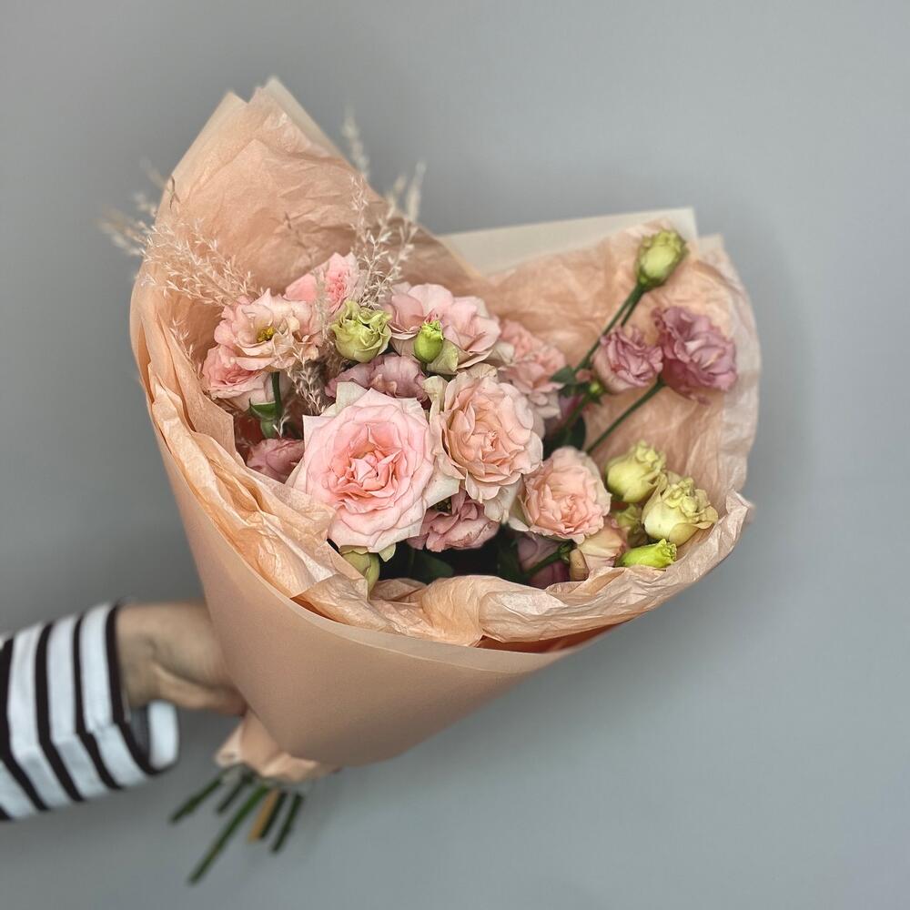 Персиковый букет с кустовой розой и эустомой с интересным раскрытиемМы используем для создания наших букетиков только качественный и свежий цветокСоздаем букеты с невероятной любовьюК букетику мы всегда прилагаем подкормку для цветочков – «chrysal”, чтобы они дольше сохраняли свою свежесть и красоту а также «Советы флористов» по уходу за срезанными цветочками Дополнительно к букетику Вы можете приобрести аквабоксы, транспортировочные коробки, крафтовые пакеты и вазы нужного размера