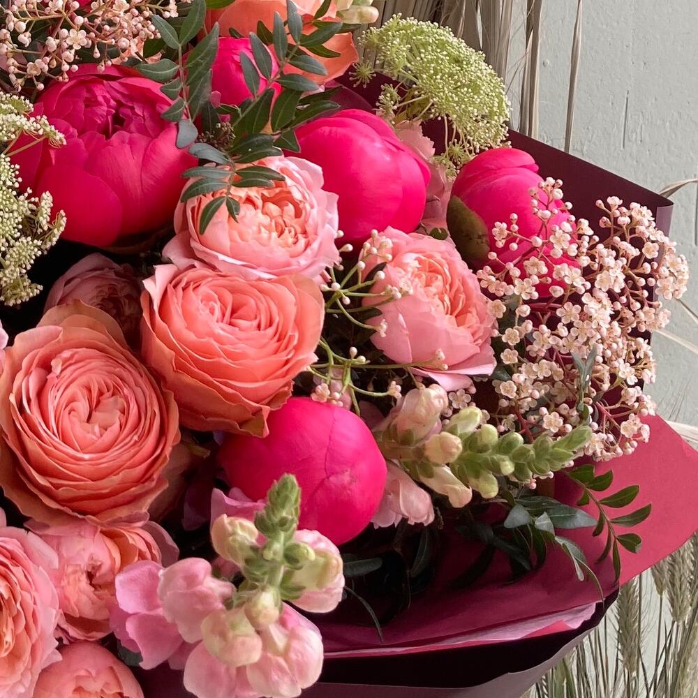 Авторский букет с пионами, пионовидными розами, львиным зевом, фатинией и зонтиками в лаконичной упаковке.Стильное цветочное решение для любого случая.
