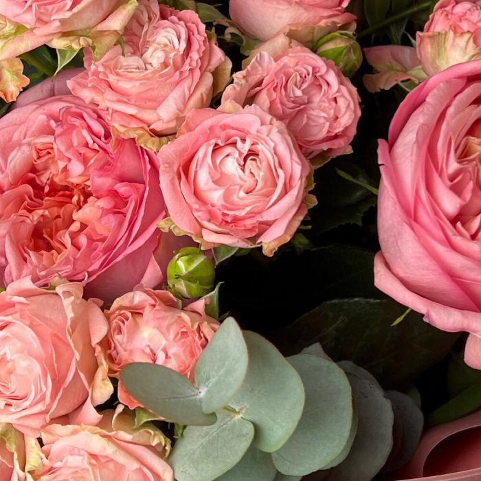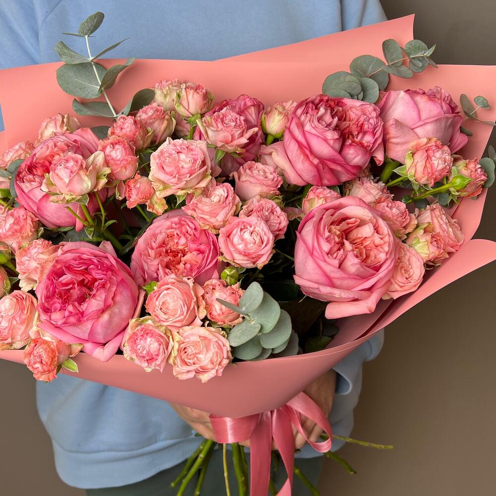 Розовый жемчуг Букет из французких роз и пион видных роз с хлопком