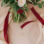 пионы бордовые – 9 шт.Роза одноголовая – 7 шт.Хиперикум красный – 5 шт.зелень декоративная – 15 шт.Лента атласная – 2 шт.