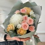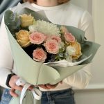 Сборный букет цветов с нежнейшей хризантемой и райскими розовыми розами: покорит сердце любой девушки, подарит настроение на весь день бабушке, сделает счастливой любимую тетю! А также воодушевит руководителя, очень обрадует маму