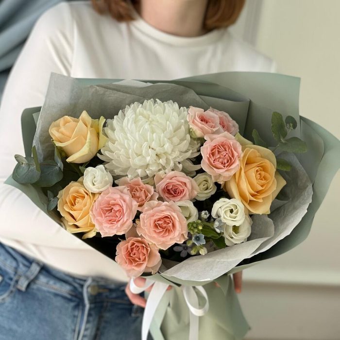Сборный букет цветов с нежнейшей хризантемой и райскими розовыми розами: покорит сердце любой девушки, подарит настроение на весь день бабушке, сделает счастливой любимую тетю! А также воодушевит руководителя, очень обрадует маму
