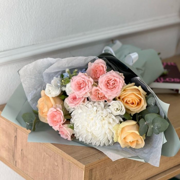 Эвкалипт – 1 шт.Кустовая роза – 2 шт.Эустома – 1 шт.Роза – 3 шт.Хризантема одноголовая – 1 шт.Оксипеталум – 1 шт.Дизайнерская упаковка – 1 шт.подкормка для срезанных цветов – 1 шт.инструкция по уходу за цветами – 1 шт.