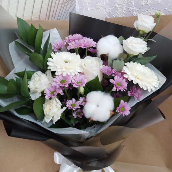 Хлопок натуральный – 2 шт.Роза Эквадор – 1 шт.Хризантема Сантини – 3 шт.эустома белая – 1 шт.Гвоздика – 2 шт.Эвкалипт – 1 шт.Рускус Израиль – 2 шт.Упаковка дизайнерская – 1 шт.Лента атласная – 1 шт.