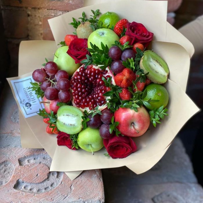Клубника – 5 шт.Лента атласная – 1 шт.Гранат – 1 шт.Киви – 2 шт.Яблоко – 4 шт.Крафт – 1 шт.Лайм – 1 шт.Роза Кенийская 40 см – 5 шт.Нобилис – 1 шт.Виноград гроздь – 1 шт.