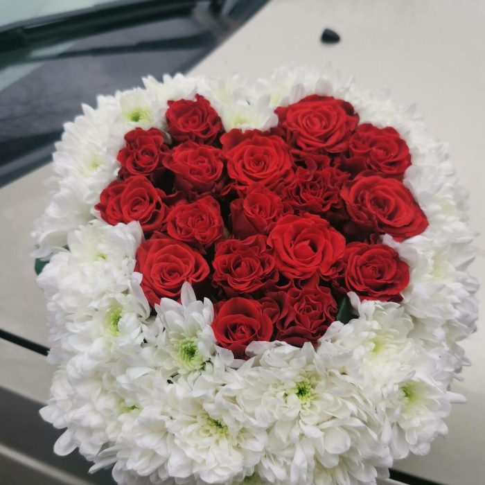 Яркое сердце из 17 красных роз и 4 веток белоснежной хризантемы. Очень нежный и привлекательный букет в форме сердца.