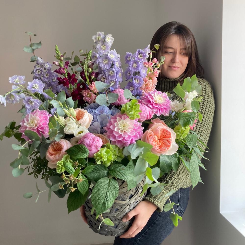 Тени в саду - Корзина с пионовидными розами, георгинами и дельфиниумом