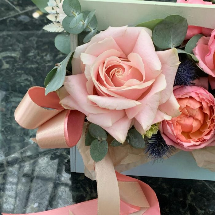 Роза одноголовая – 1 шт.джульетта роза пионовидная – 1 шт.Лизиантус – 1 шт.Диантус – 3 шт.Эрингиум – 1 шт.
