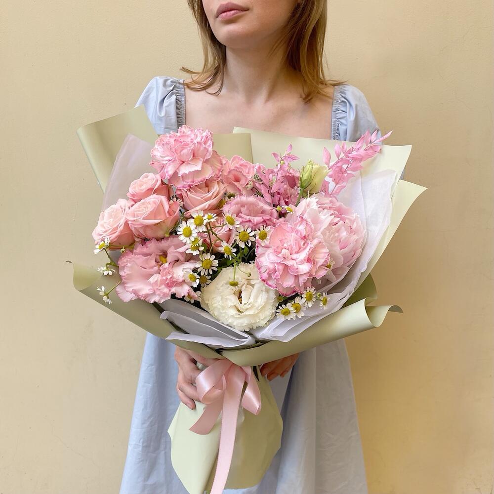 Категорий: Гвоздики, Кустовые розы, Лизиантусы, Пионовидные розы, Розы, Ромашки