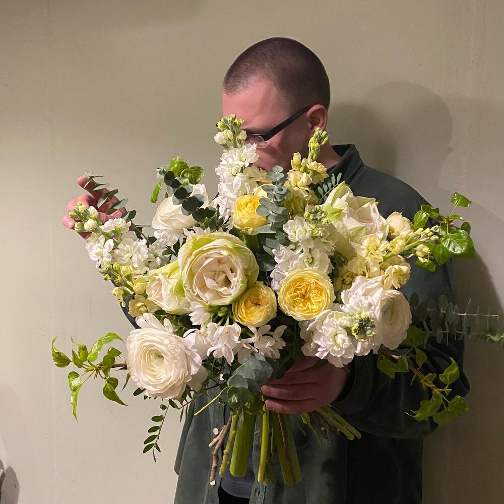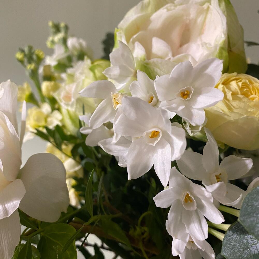 Амариллис – 2 шт.Нарцисс кустовой – 3 шт.Ранункулюс – 4 шт.Маттиола – 7 шт.Роза пионовидная кустовая – 3 шт.Эвкалипт – 9 шт.Ветки – 2 шт.Сирень белая – 2 шт.