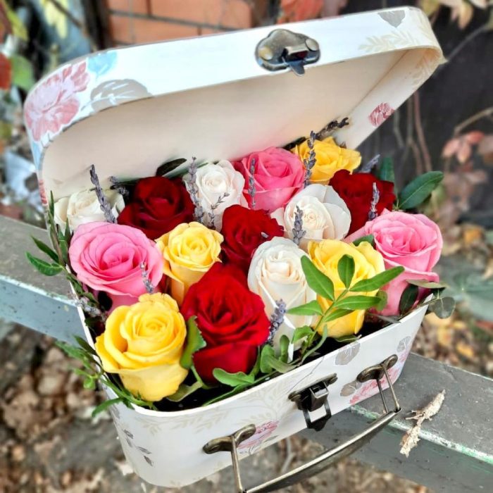 Роза разноцветная – 15 шт. Чемодан дизайнерский – 1 шт. зелень декоративная – 1 шт.