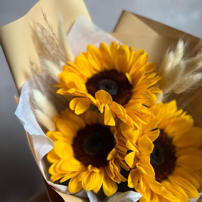 Подсолнух – 3 шт.сухоцветы пучок – 2 шт.декоративная упаковка – 1 шт.Атласная лента – 1 шт.