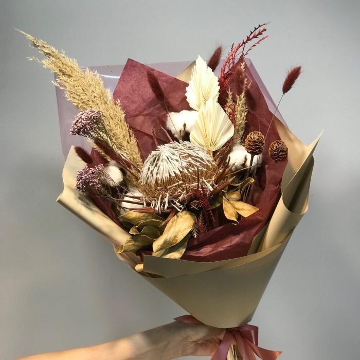 Хлопок – 5 шт.Протея – 1 шт.Пальма – 2 шт.Озотамнус – 2 шт.Бруния – 1 шт.кортадерия – 2 шт.лагурус пучок – 1 шт.гривеллия крашенная – 2 шт.Упаковка дизайнерская – 1 шт.