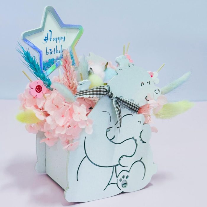 гортензия стабилизированная персиковая – 1 шт.пшеница (сухоцвет) разноцветный – 2 шт.хлопок (сухоцвет) радужный – 1 шт.лагурус (сухоцвет) разноцветный – 5 шт.декор на палочке – 6 шт.кашпо деревянное фигурное мишки – 1 шт.декор с блестками – 1 шт.Упаковка дизайнерская – 1 шт.