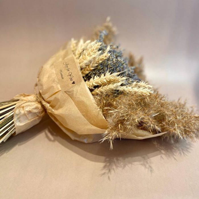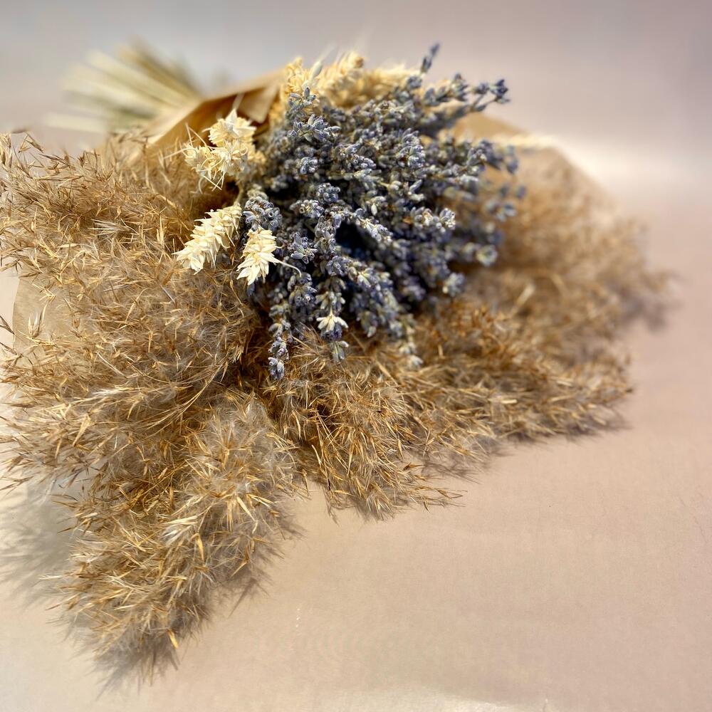 Лаванда (сухоцвет) – 1 шт.Пшеница (сухоцвет) – 15 шт.Дизайнерская упаковка – 1 шт.пампасная трава – 4 шт.