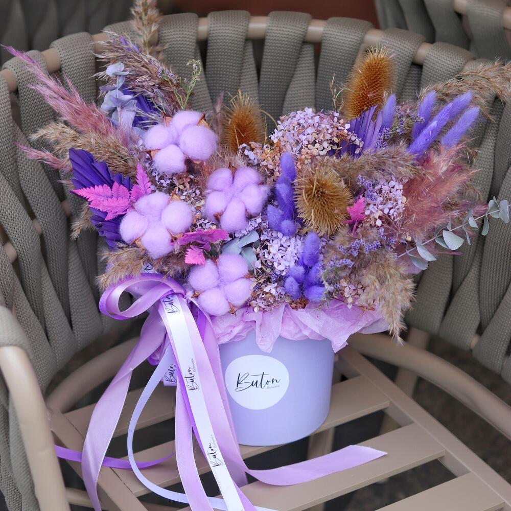 Гортензия – 3 шт.Лимониум – 1 шт.Папоротник – 1 шт.Хлопок – 4 шт.Лента атласная – 1 шт.Пальма – 3 шт.Банксия – 3 шт.Лагурус – 15 шт.Кашпо керамическое – 1 шт.Шоколадка – 1 шт.кортадерия – 3 шт.октрыточка с вашими пожеланиями – 1 шт.